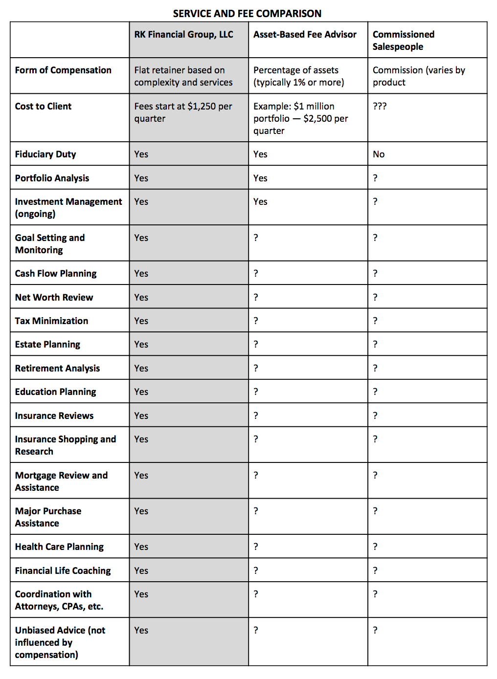 As a registered investment advisor with a flat retainer based on complexity and services fee model, RK Financial Group, LLC., is paid only by the client. Developing and implementing a financial life plan is a complex process that takes time, knowledge, and resources, and our clients understand and appreciate the commitment involved.